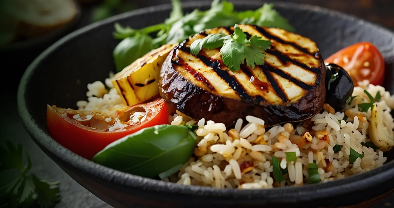Golden falafel, basmati rice, fresh vegetables, tahini drizzle.